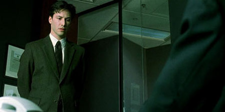 So Keanu Reeves is like this Dilbert-type with a lame cube job…