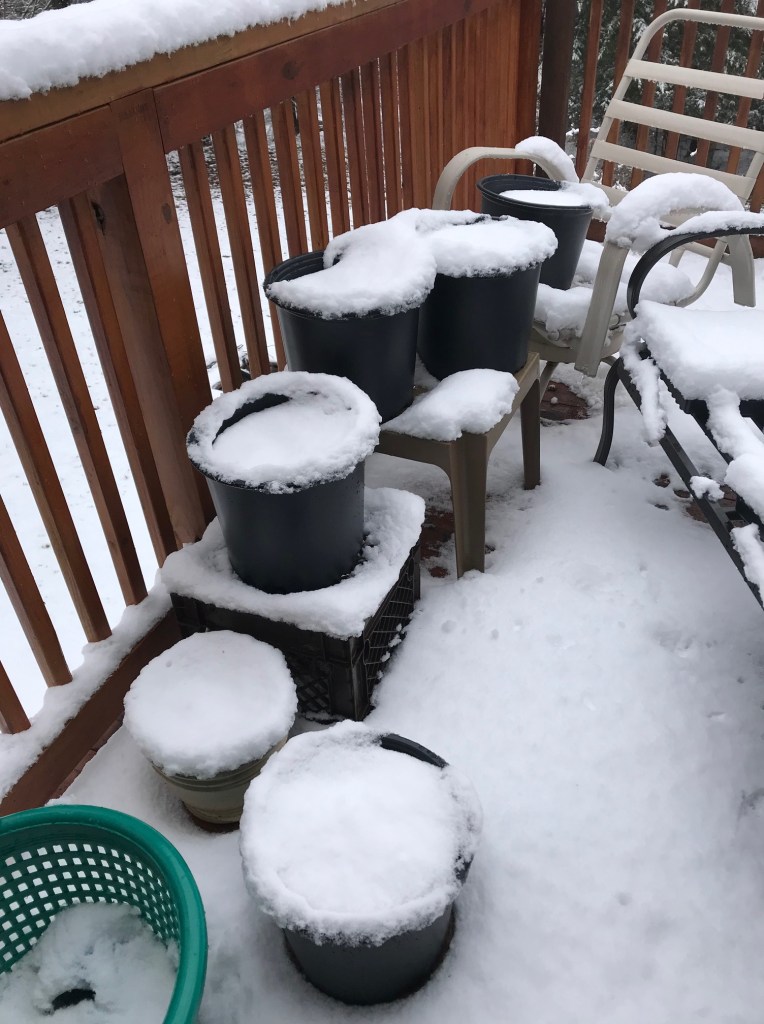 But, I’m sucking it up and dumping expensive purchased soil into containers because skipping the 2021 growing season entirely seems too sad to bear, and I’m nothing if not good at pivots. Besides, it’s better than the labor debt of pounding t-posts for fencing we’d eventually have to dig out later. Thus the forested land can remain the domain of our small chicken flock and our ever-barking Great Pyr, and the deck can be modular plant central. Well, when all this melts.